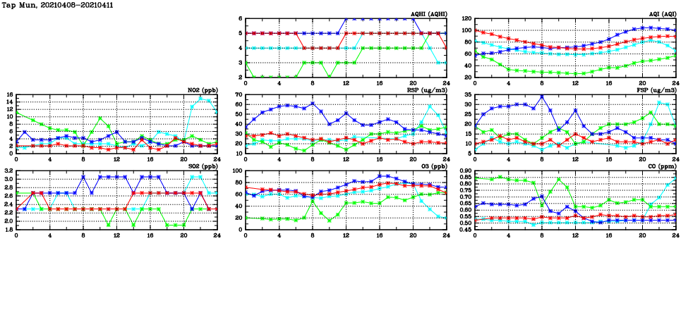| Air Quality Data Time Series in Tap Mun (2021/04/11) | ( Line colors: Day -3 Day -2 Day -1 Current day ) | 2D Map Current AQHI |