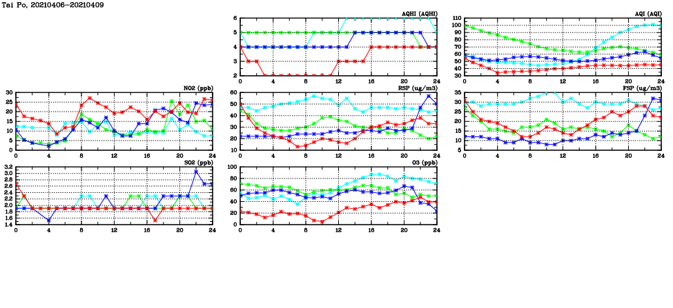 | Air Quality Data Time Series in Tai Po (2021/04/09) | ( Line colors: Day -3 Day -2 Day -1 Current day ) | 2D Map Current AQHI |