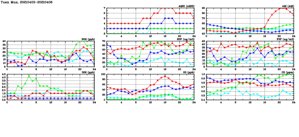 | Air Quality Data Time Series in Tuen Mun (2021/04/06) | ( Line colors: Day -3 Day -2 Day -1 Current day ) | 2D Map Current AQHI |