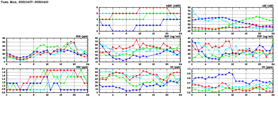 | Air Quality Data Time Series in Tuen Mun (2021/04/10) | ( Line colors: Day -3 Day -2 Day -1 Current day ) | 2D Map Current AQHI |