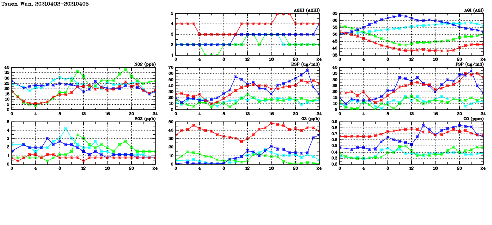 | Air Quality Data Time Series in Tsuen Wan (2021/04/05) | ( Line colors: Day -3 Day -2 Day -1 Current day ) | 2D Map Current AQHI |