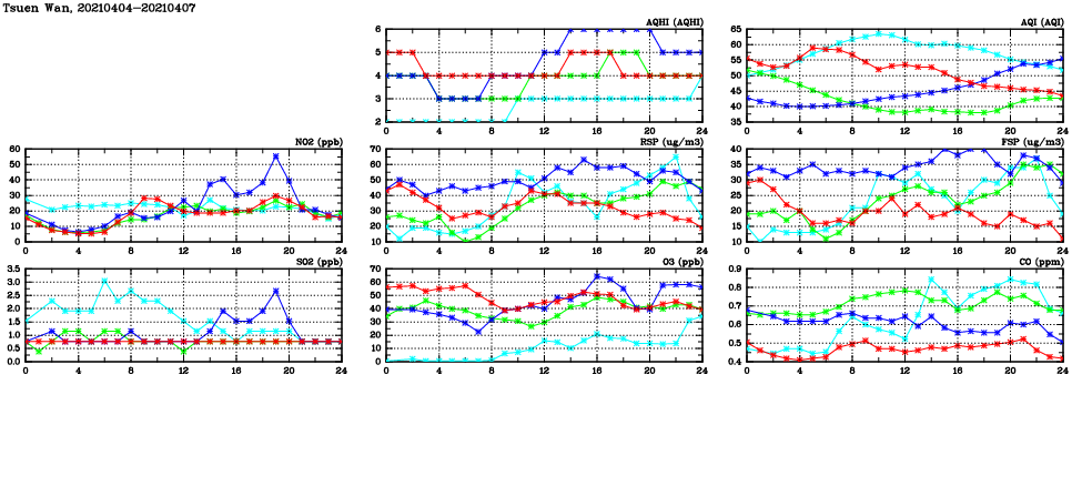 | Air Quality Data Time Series in Tsuen Wan (2021/04/07) | ( Line colors: Day -3 Day -2 Day -1 Current day ) | 2D Map Current AQHI |