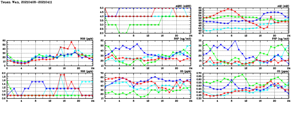 | Air Quality Data Time Series in Tsuen Wan (2021/04/11) | ( Line colors: Day -3 Day -2 Day -1 Current day ) | 2D Map Current AQHI |