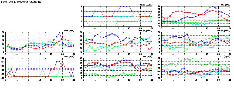 Air Quality Data Time Series in Yuen Long (2021/04/11) | ( Line colors: Day -3 Day -2 Day -1 Current day ) | 2D Map Current AQHI |