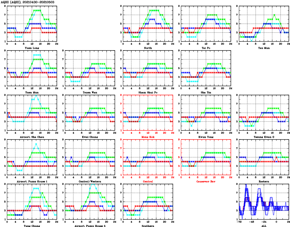 | Air Quality Data Time Series for AQHI (2021/05/03) | ( Line colors: Day -3 Day -2 Day -1 Current day ) | 2D Map Current AQHI |
