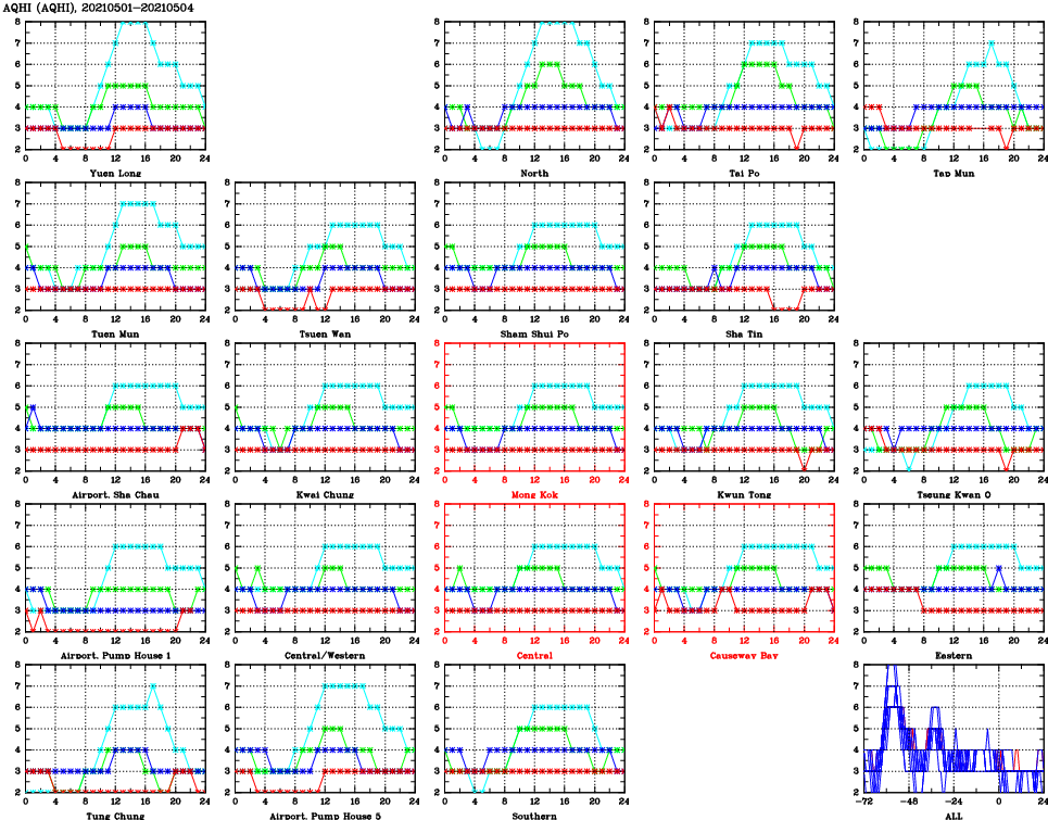 | Air Quality Data Time Series for AQHI (2021/05/04) | ( Line colors: Day -3 Day -2 Day -1 Current day ) | 2D Map Current AQHI |