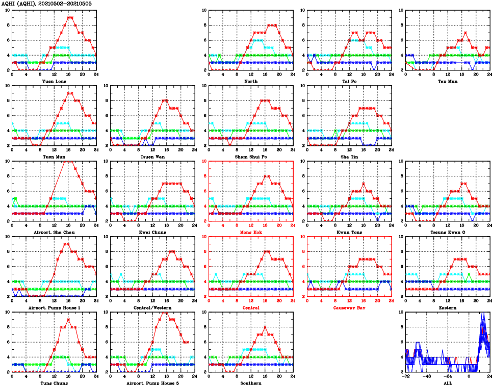 | Air Quality Data Time Series for AQHI (2021/05/05) | ( Line colors: Day -3 Day -2 Day -1 Current day ) | 2D Map Current AQHI |