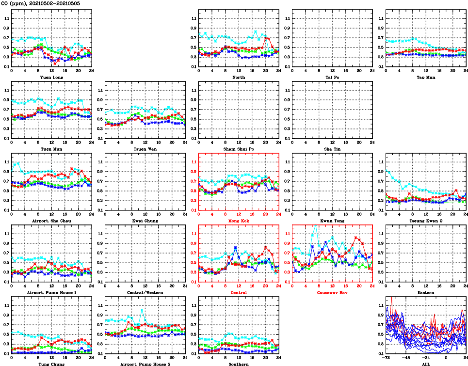 | Air Quality Data Time Series for CO (2021/05/05) | ( Line colors: Day -3 Day -2 Day -1 Current day ) | 2D Map Current AQHI |