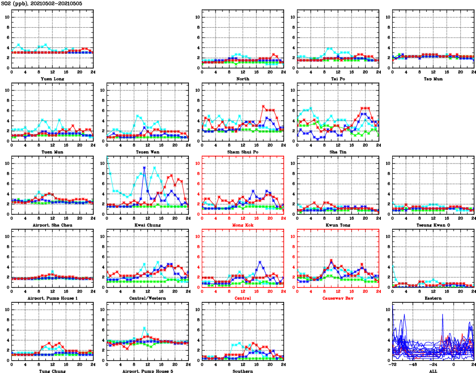 | Air Quality Data Time Series for SO2 (2021/05/05) | ( Line colors: Day -3 Day -2 Day -1 Current day ) | 2D Map Current AQHI |