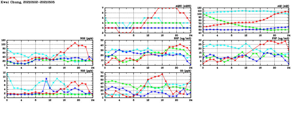 | Air Quality Data Time Series in Kwai Chung (2021/05/05) | ( Line colors: Day -3 Day -2 Day -1 Current day ) | 2D Map Current AQHI |