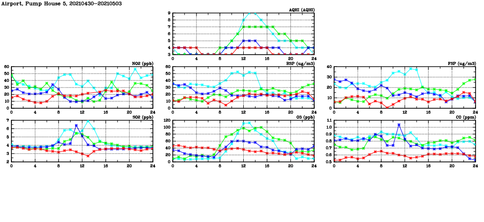 | Air Quality Data Time Series in Airport, Pump House 5 (2021/05/03) | ( Line colors: Day -3 Day -2 Day -1 Current day ) | 2D Map Current AQHI |