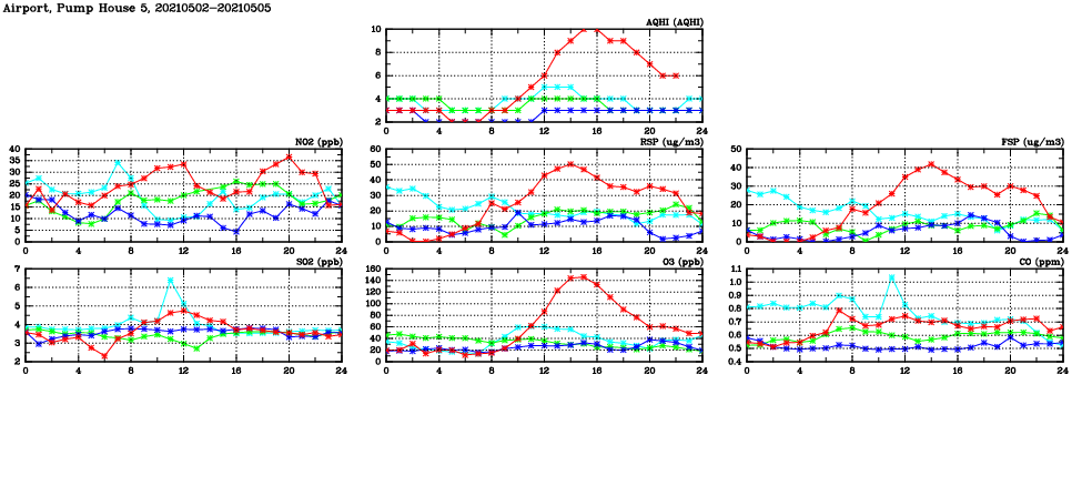 | Air Quality Data Time Series in Airport, Pump House 5 (2021/05/05) | ( Line colors: Day -3 Day -2 Day -1 Current day ) | 2D Map Current AQHI |