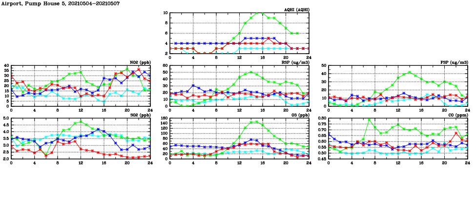 | Air Quality Data Time Series in Airport, Pump House 5 (2021/05/07) | ( Line colors: Day -3 Day -2 Day -1 Current day ) | 2D Map Current AQHI |