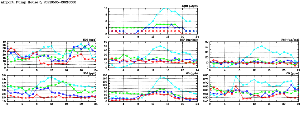 | Air Quality Data Time Series in Airport, Pump House 5 (2021/05/08) | ( Line colors: Day -3 Day -2 Day -1 Current day ) | 2D Map Current AQHI |