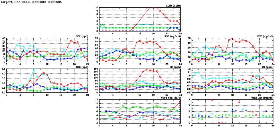 | Air Quality Data Time Series in Airport, Sha Chau (2021/05/05) | ( Line colors: Day -3 Day -2 Day -1 Current day ) | 2D Map Current AQHI |