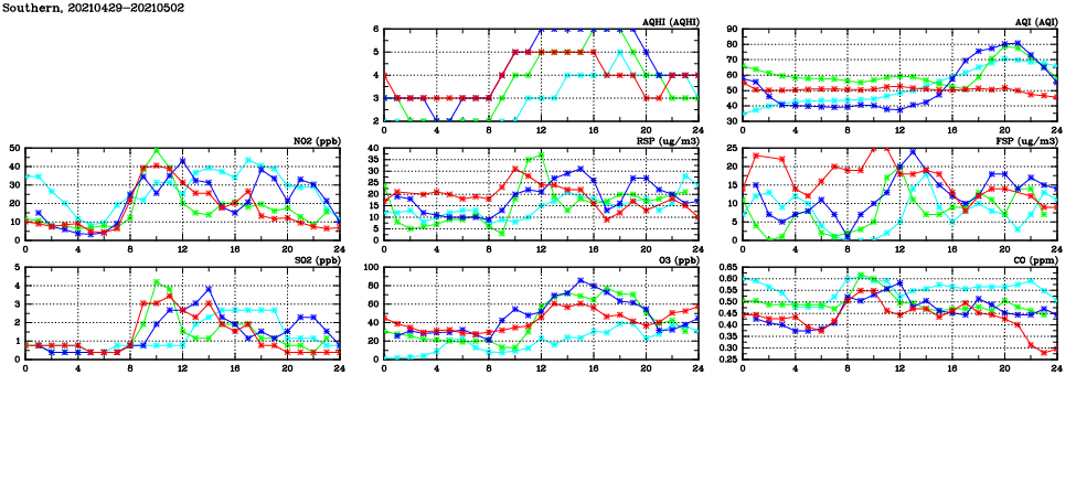 | Air Quality Data Time Series in Southern (2021/05/02) | ( Line colors: Day -3 Day -2 Day -1 Current day ) | 2D Map Current AQHI |