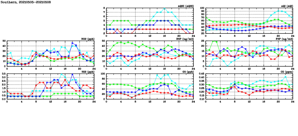 | Air Quality Data Time Series in Southern (2021/05/08) | ( Line colors: Day -3 Day -2 Day -1 Current day ) | 2D Map Current AQHI |