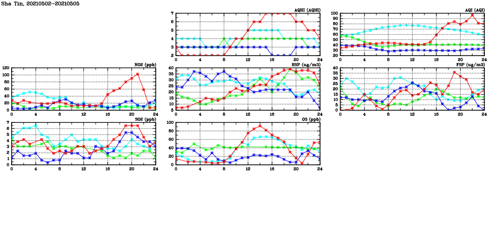 | Air Quality Data Time Series in Sha Tin (2021/05/05) | ( Line colors: Day -3 Day -2 Day -1 Current day ) | 2D Map Current AQHI |