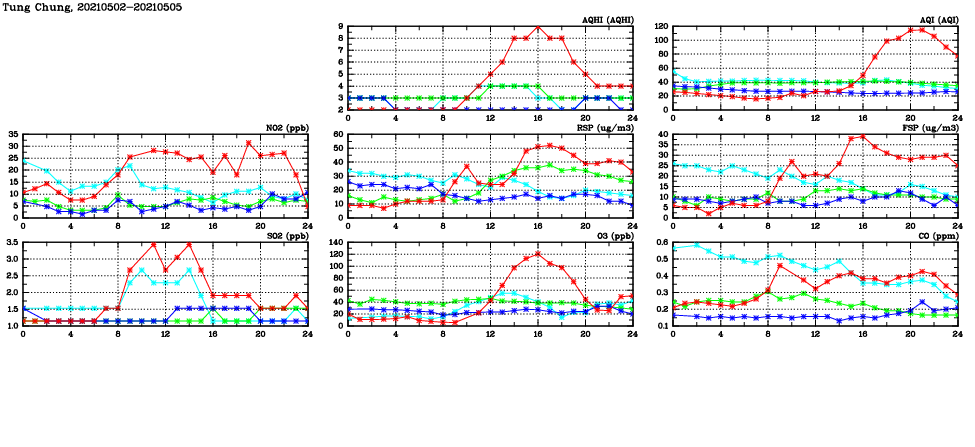 | Air Quality Data Time Series in Tung Chung (2021/05/05) | ( Line colors: Day -3 Day -2 Day -1 Current day ) | 2D Map Current AQHI |