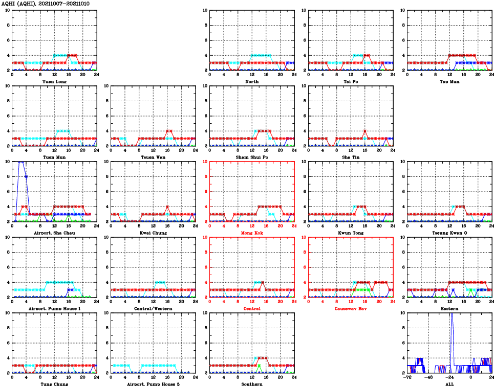 | Air Quality Data Time Series for AQHI (2021/10/10) | ( Line colors: Day -3 Day -2 Day -1 Current day ) | 2D Map Current AQHI |