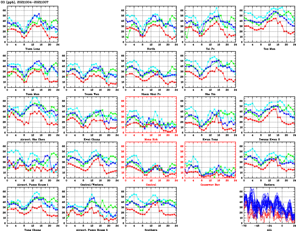 | Air Quality Data Time Series for O3 (2021/10/07) | ( Line colors: Day -3 Day -2 Day -1 Current day ) | 2D Map Current AQHI |