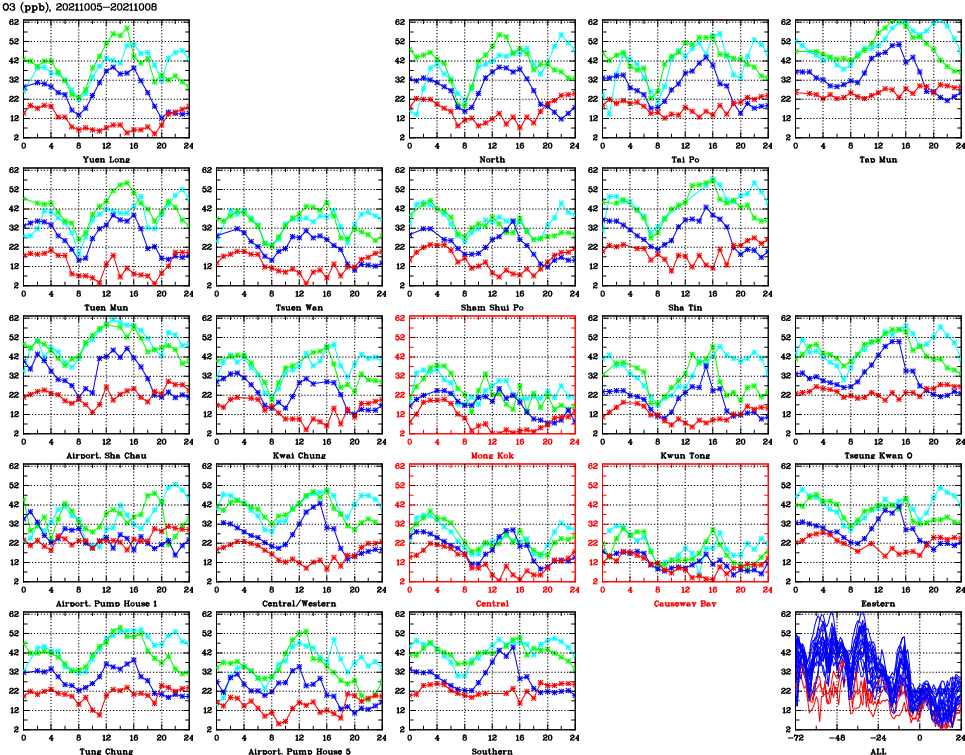| Air Quality Data Time Series for O3 (2021/10/08) | ( Line colors: Day -3 Day -2 Day -1 Current day ) | 2D Map Current AQHI |