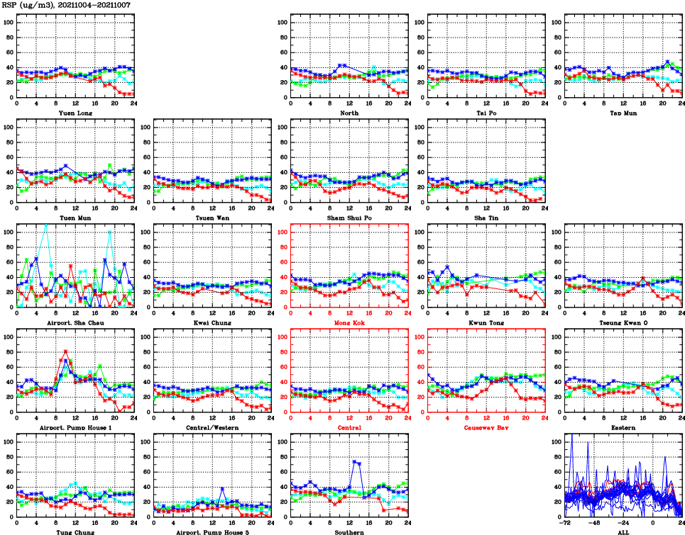 | Air Quality Data Time Series for RSP (2021/10/07) | ( Line colors: Day -3 Day -2 Day -1 Current day ) | 2D Map Current AQHI |