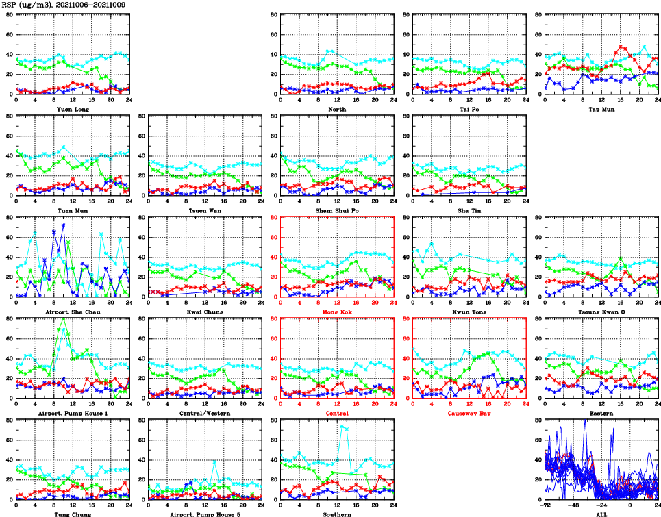 | Air Quality Data Time Series for RSP (2021/10/09) | ( Line colors: Day -3 Day -2 Day -1 Current day ) | 2D Map Current AQHI |