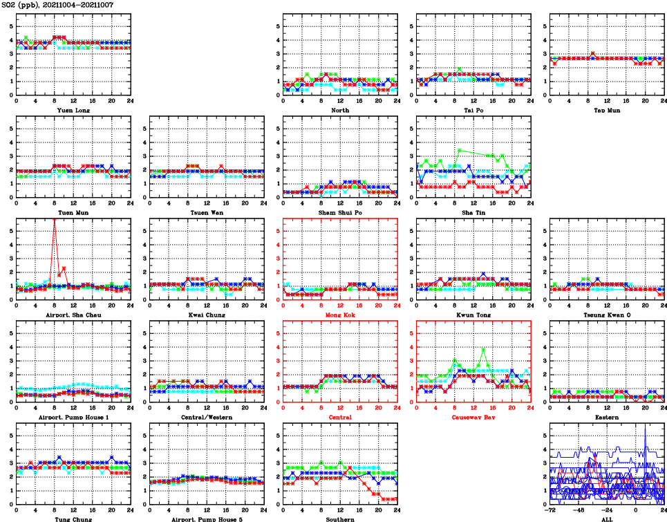 | Air Quality Data Time Series for SO2 (2021/10/07) | ( Line colors: Day -3 Day -2 Day -1 Current day ) | 2D Map Current AQHI |