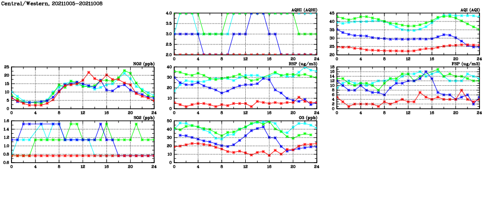 | Air Quality Data Time Series in Central/Western (2021/10/08) | ( Line colors: Day -3 Day -2 Day -1 Current day ) | 2D Map Current AQHI |