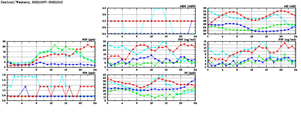 | Air Quality Data Time Series in Central/Western (2021/10/10) | ( Line colors: Day -3 Day -2 Day -1 Current day ) | 2D Map Current AQHI |
