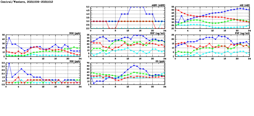 | Air Quality Data Time Series in Central/Western (2021/10/12) | ( Line colors: Day -3 Day -2 Day -1 Current day ) | 2D Map Current AQHI |
