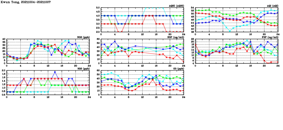 | Air Quality Data Time Series in Kwun Tong (2021/10/07) | ( Line colors: Day -3 Day -2 Day -1 Current day ) | 2D Map Current AQHI |