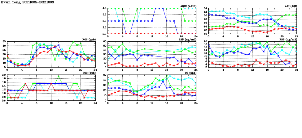 | Air Quality Data Time Series in Kwun Tong (2021/10/08) | ( Line colors: Day -3 Day -2 Day -1 Current day ) | 2D Map Current AQHI |