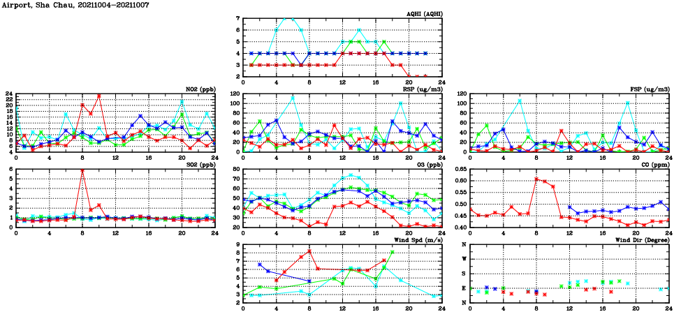| Air Quality Data Time Series in Airport, Sha Chau (2021/10/07) | ( Line colors: Day -3 Day -2 Day -1 Current day ) | 2D Map Current AQHI |