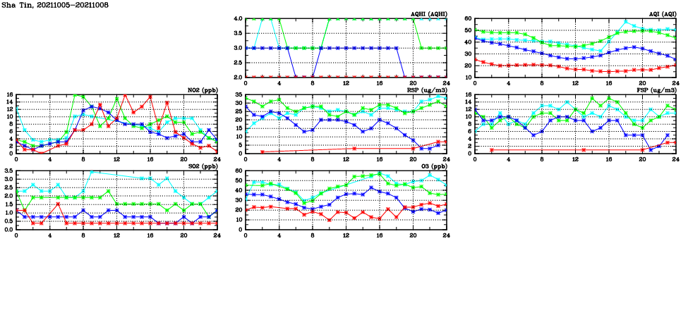 | Air Quality Data Time Series in Sha Tin (2021/10/08) | ( Line colors: Day -3 Day -2 Day -1 Current day ) | 2D Map Current AQHI |