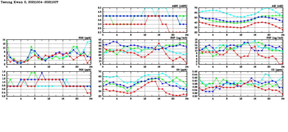 | Air Quality Data Time Series in Tseung Kwan O (2021/10/07) | ( Line colors: Day -3 Day -2 Day -1 Current day ) | 2D Map Current AQHI |