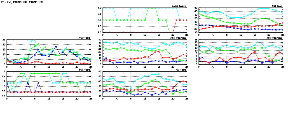 | Air Quality Data Time Series in Tai Po (2021/10/09) | ( Line colors: Day -3 Day -2 Day -1 Current day ) | 2D Map Current AQHI |