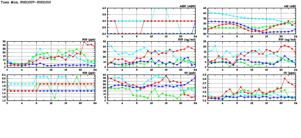 | Air Quality Data Time Series in Tuen Mun (2021/10/10) | ( Line colors: Day -3 Day -2 Day -1 Current day ) | 2D Map Current AQHI |