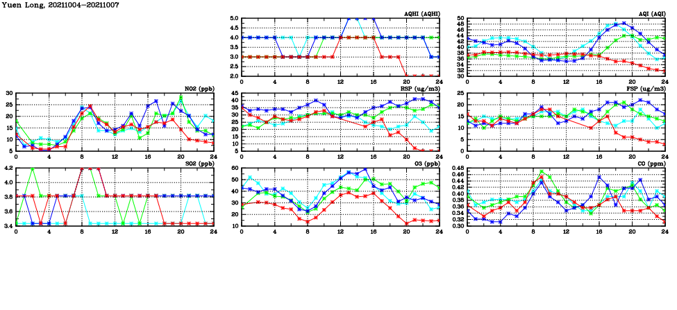 | Air Quality Data Time Series in Yuen Long (2021/10/07) | ( Line colors: Day -3 Day -2 Day -1 Current day ) | 2D Map Current AQHI |