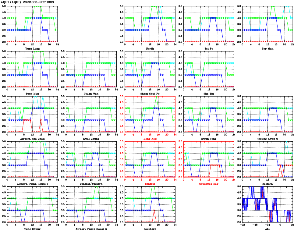 | Air Quality Data Time Series for AQHI (2021/10/08) | ( Line colors: Day -3 Day -2 Day -1 Current day ) | 2D Map Current AQHI |