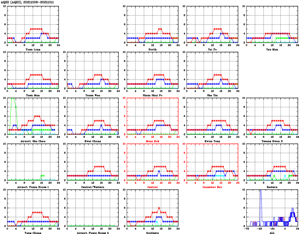 | Air Quality Data Time Series for AQHI (2021/10/11) | ( Line colors: Day -3 Day -2 Day -1 Current day ) | 2D Map Current AQHI |