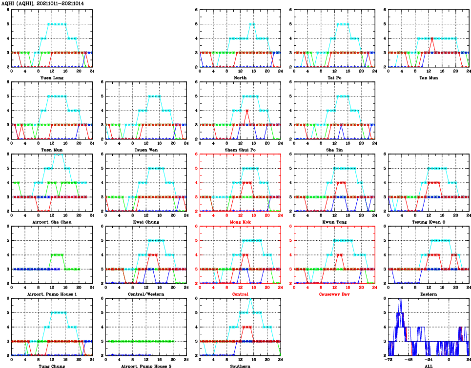 | Air Quality Data Time Series for AQHI (2021/10/14) | ( Line colors: Day -3 Day -2 Day -1 Current day ) | 2D Map Current AQHI |
