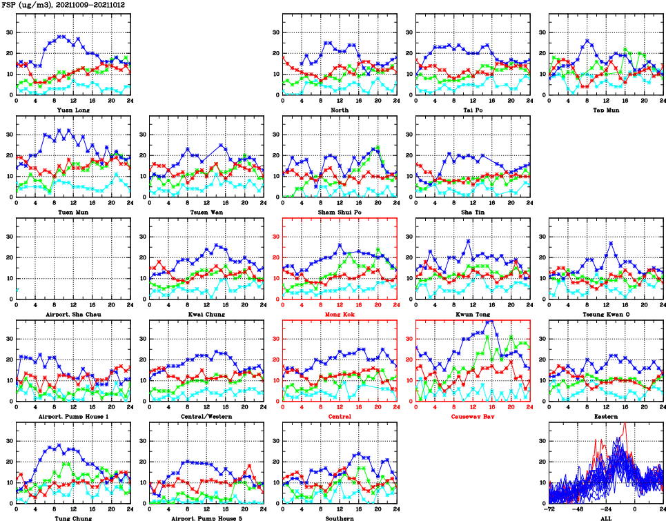 | Air Quality Data Time Series for FSP (2021/10/12) | ( Line colors: Day -3 Day -2 Day -1 Current day ) | 2D Map Current AQHI |