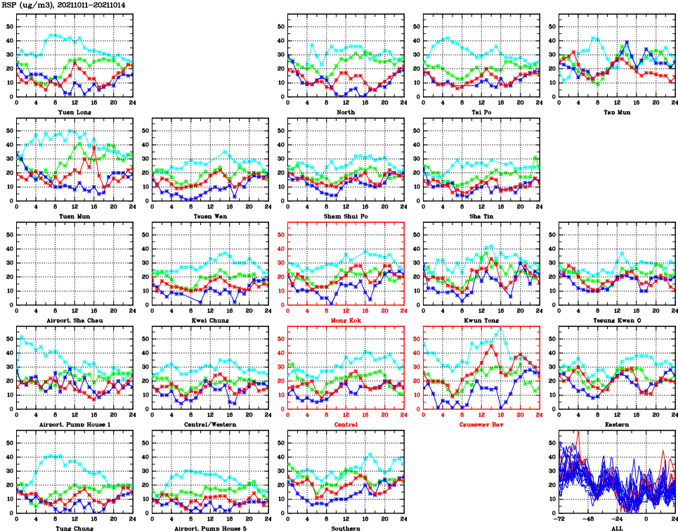 | Air Quality Data Time Series for RSP (2021/10/14) | ( Line colors: Day -3 Day -2 Day -1 Current day ) | 2D Map Current AQHI |