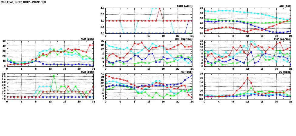 | Air Quality Data Time Series in Central (2021/10/10) | ( Line colors: Day -3 Day -2 Day -1 Current day ) | 2D Map Current AQHI |