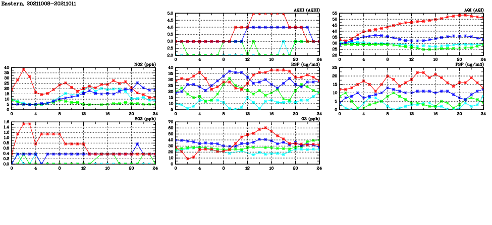 | Air Quality Data Time Series in Eastern (2021/10/11) | ( Line colors: Day -3 Day -2 Day -1 Current day ) | 2D Map Current AQHI |