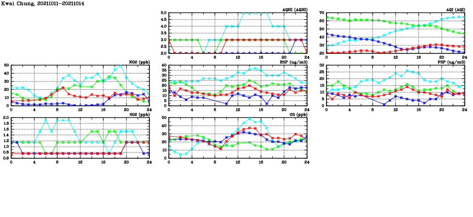 | Air Quality Data Time Series in Kwai Chung (2021/10/14) | ( Line colors: Day -3 Day -2 Day -1 Current day ) | 2D Map Current AQHI |