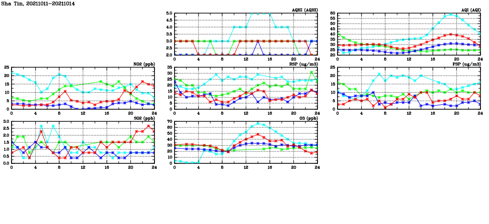 | Air Quality Data Time Series in Sha Tin (2021/10/14) | ( Line colors: Day -3 Day -2 Day -1 Current day ) | 2D Map Current AQHI |