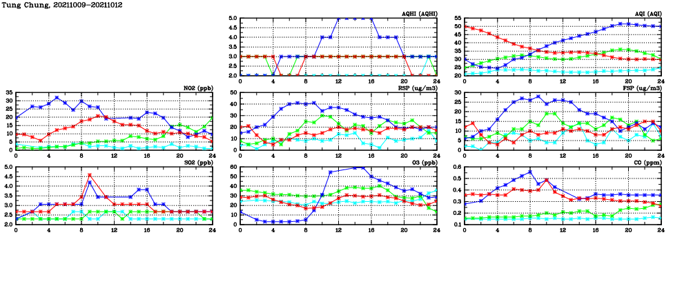 | Air Quality Data Time Series in Tung Chung (2021/10/12) | ( Line colors: Day -3 Day -2 Day -1 Current day ) | 2D Map Current AQHI |